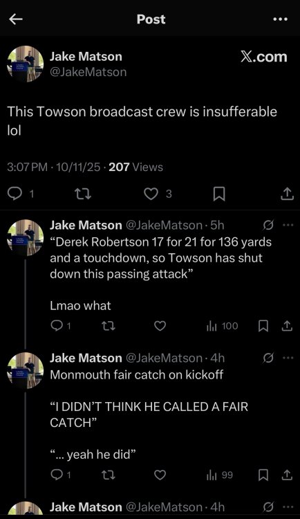 I would be remiss if I didn't give a quick shout-out to my local friends at Kennesaw State University for clinching FBS Bowl eligibility earlier this week. What a tremendous story and accomplishment. Football program launched from scratch in 2015. Notable success at the FCS level over a several years, take a leap of faith into FBS in 2024 and become bowl eligible in their first season in which they could do so. Their success and path should be the blueprint for Towson. Eigenbrot, Ginsberg and staff should fly to ATL for in-person conversations with KSU's longtime AD, Milton Overton and KSU's President Kat Schwaig for a deep dive into how they've achieved what they've achieved so quickly. All of that, of course, assumes that Eigenbrot and Ginsberg even care about the long-term success & viability of TU's football program. Will KSU ever compete for an FBS Playoff spot? Highly unlikely. However, playing nationally televised games on reputable networks against teams people have heard of with the chance of making one of dozens of bowl games seems like a fun and rewarding existence. Go Tigers & Go Owls.4 points